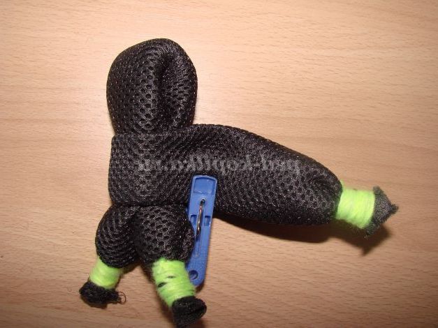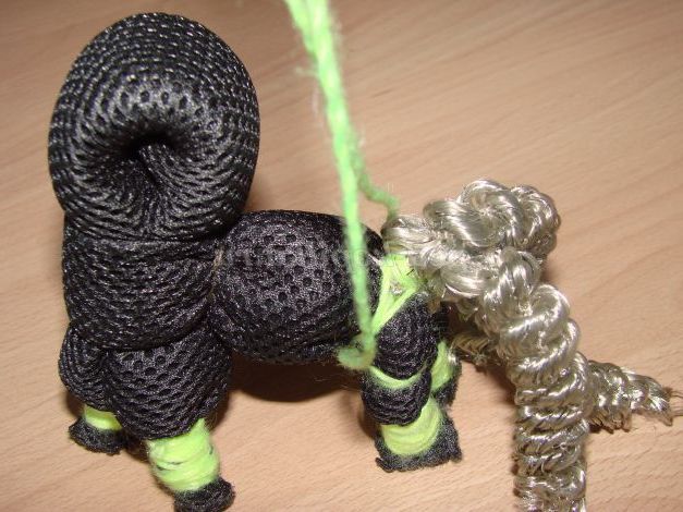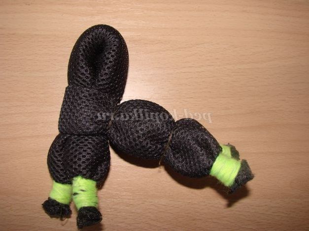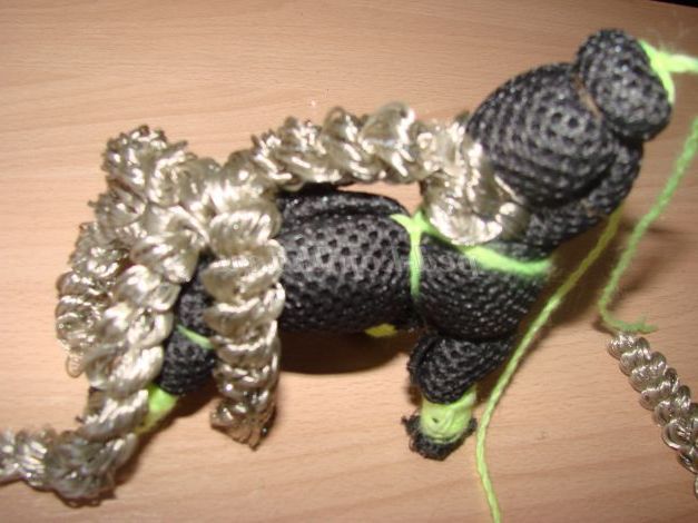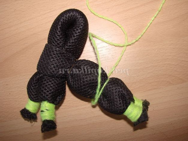 Закріпимо хвостик ниткою і цією ж ниткою обмотаємо задні ніжки вгорі, підтягуючи їх під животик.