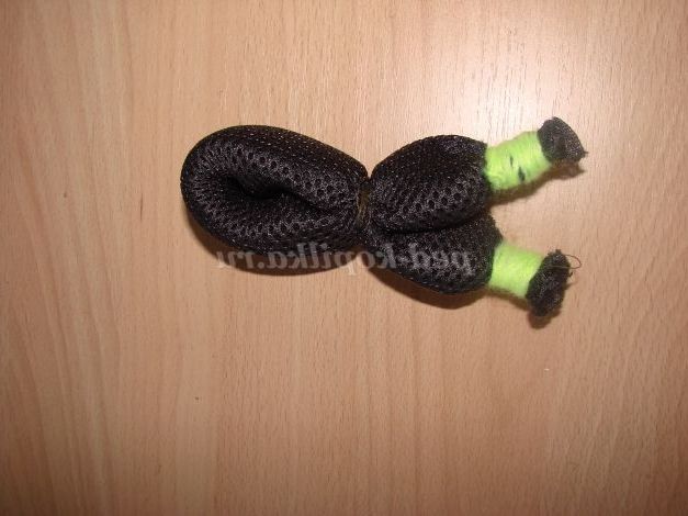 Одну трубочку-валик складемо навпіл і перетягнемо нитками, відокремлюючи голову і ноги.