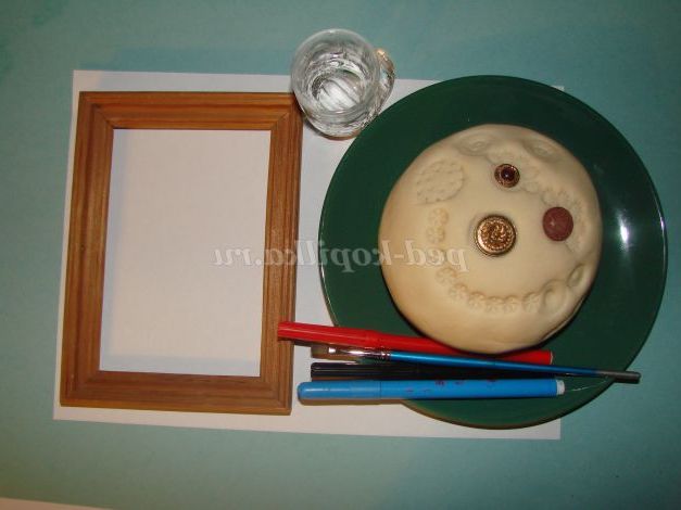 Тісто, рельєфні гудзики, використані фломастери, рамочки, білий папір, олівець, пензлик, вода