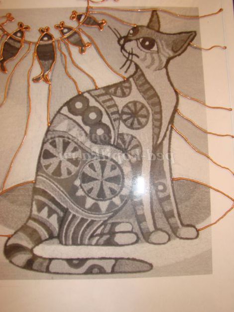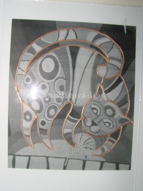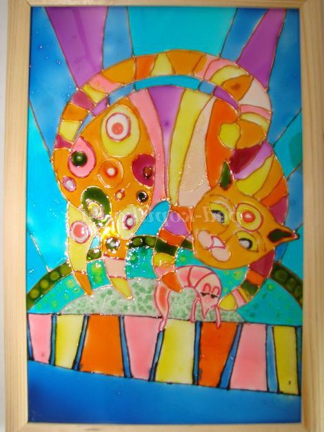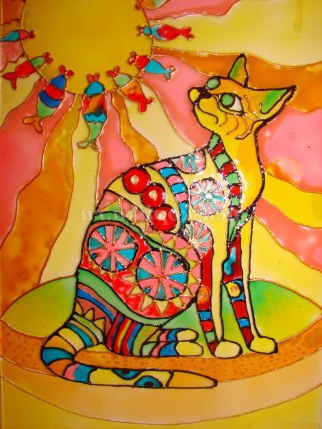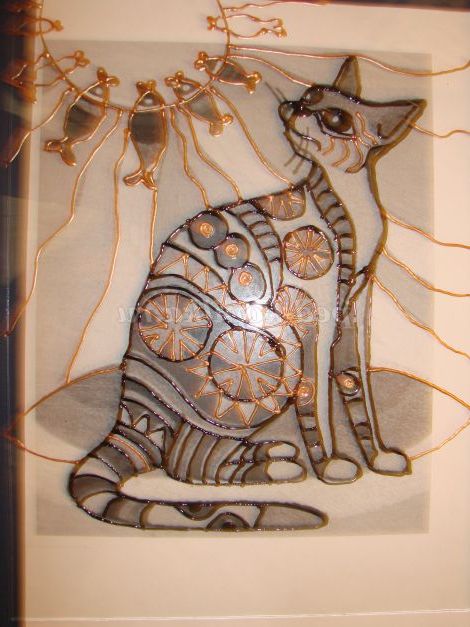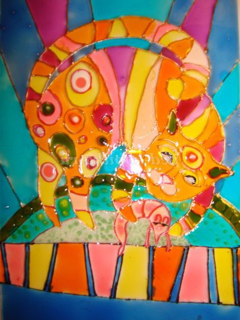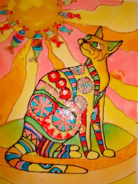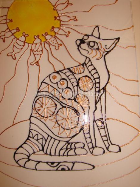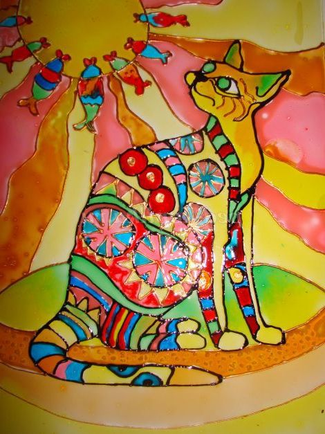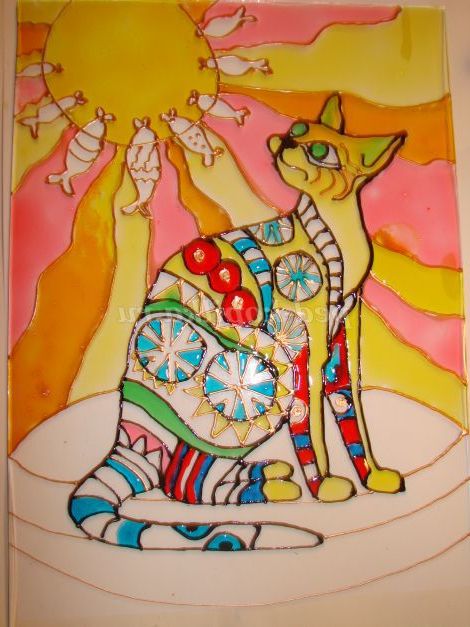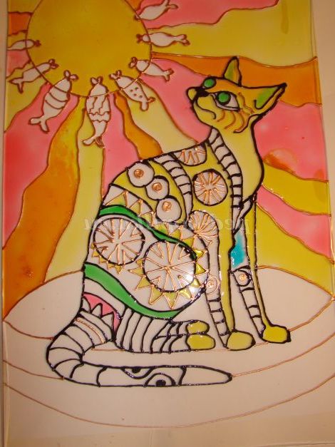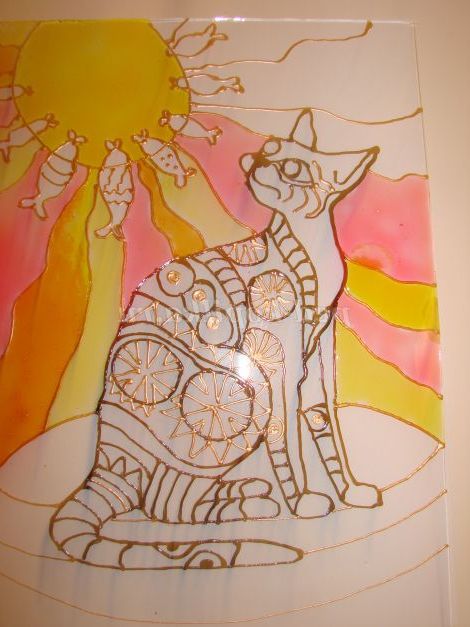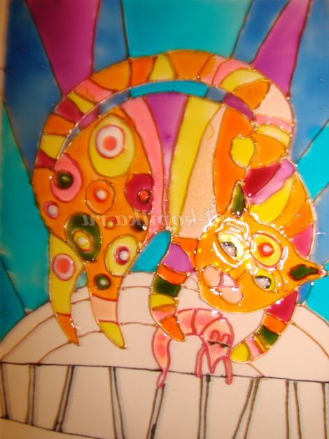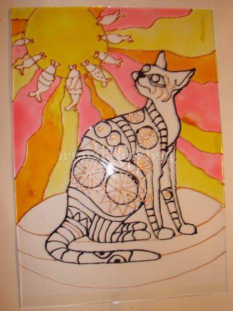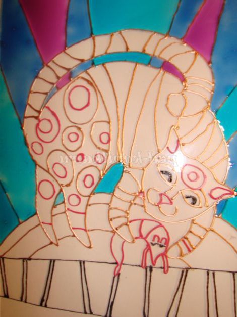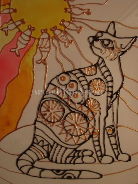 3. Кота я обвела чорним контуром. Малюнок у кота - бронзовим ( але, якщо Ви новачок в роботі з вітражними фарбами - візьміть тільки чорний контур. Якщо випадково зайдете фарбою на контур, це буде не так помітно).