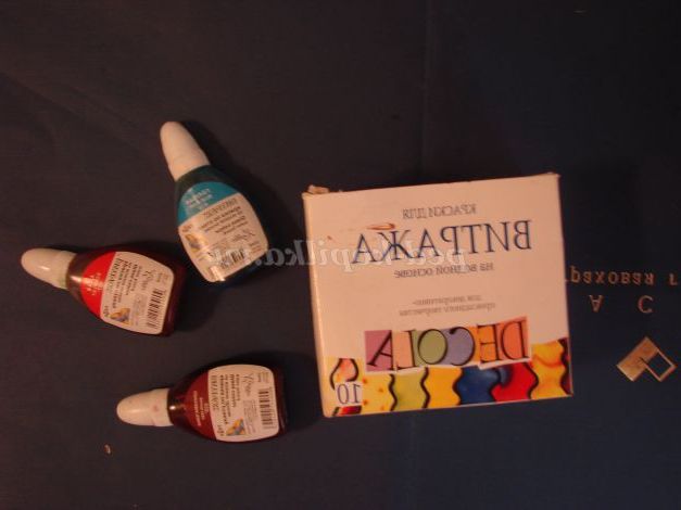 4. Вітражні фарби ( я скористалася Деколой і Гамою. Мені подобаються їх кольору, прозорості, склоподібність при висиханні, і потім вони чудово змішуються) . Найдоступніші з вітражних фарб і аж ніяк не найгірші.