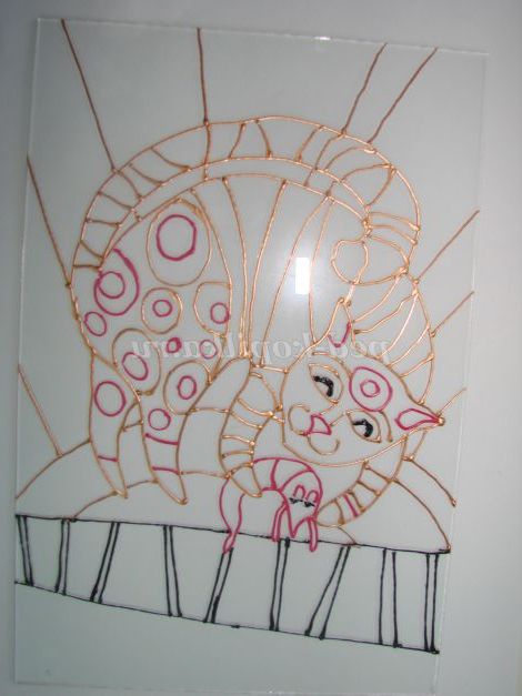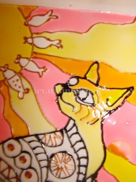 Малюнок перекладається на поверхню контуром (не забудьте знежирити поверхню!), (прослідкуйте, щоб всі лінії контуру були замкнуті, інакше фарба витече за його межі туди, куди зовсім не потрібно, і можна зіпсувати роботу).