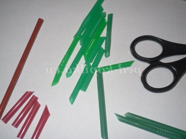 - Зробити з трубочок-соломинок заготовки гілочок різної довжини, для цього спочатку необхідно розправити колінця і нарізати під невеликим кутом, щоб гілочки в центрі підходили близько один до одного.