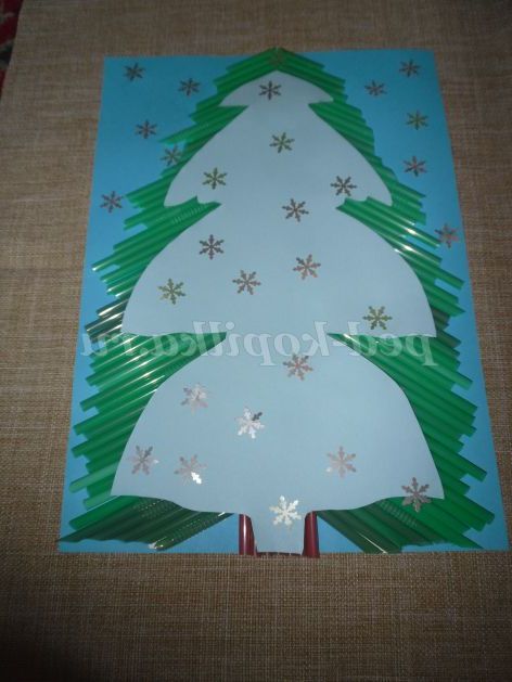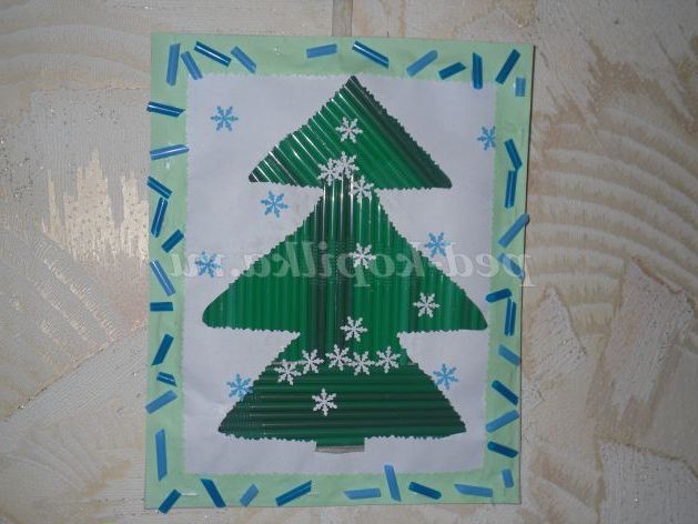 - Наклеїти на картон синього кольору. Ялинка готова.