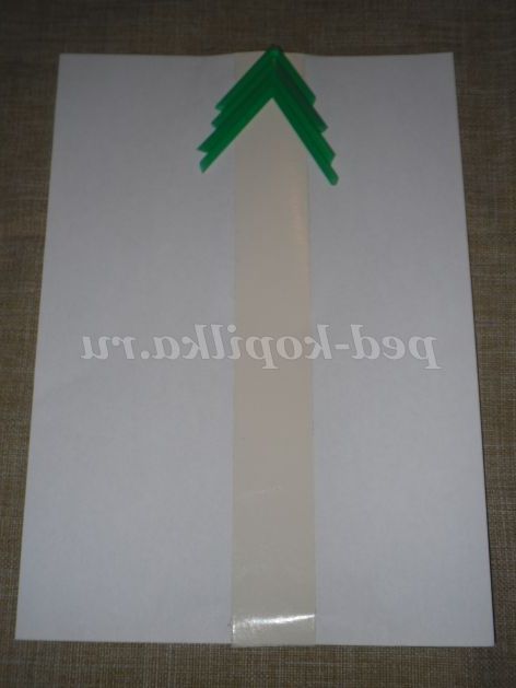 - На білий аркуш паперу наклеїти подвійний скотч, за формою нагадує трикутник в 2-3 ряди орієнтуючись на розмір, яким має бути ялинка.