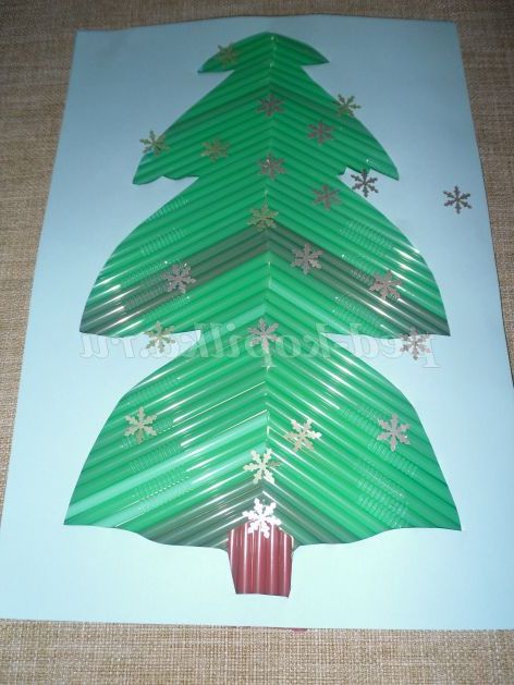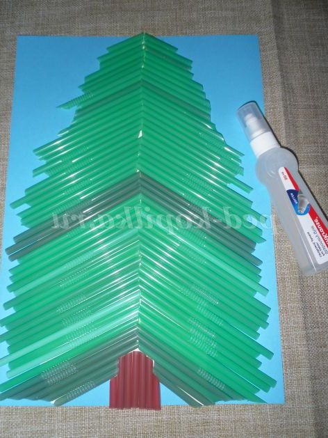 - По всій висоті ялинки приклеювати соломинки, які збільшуються до низу.