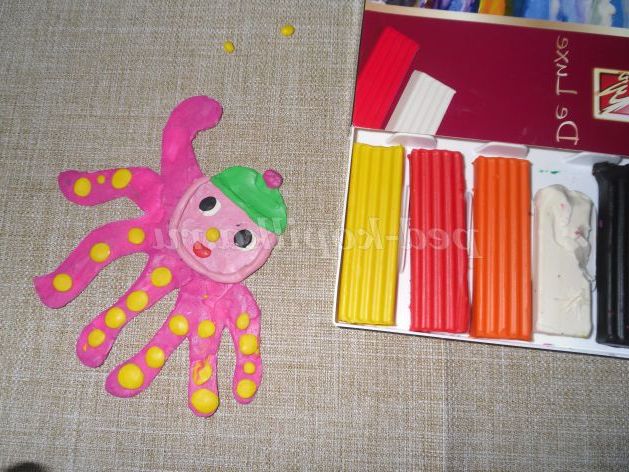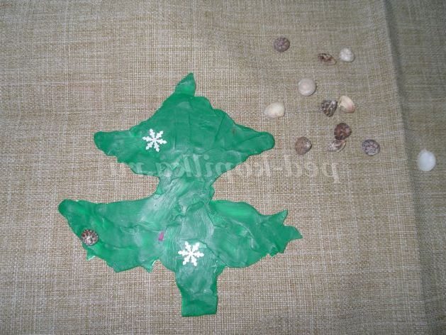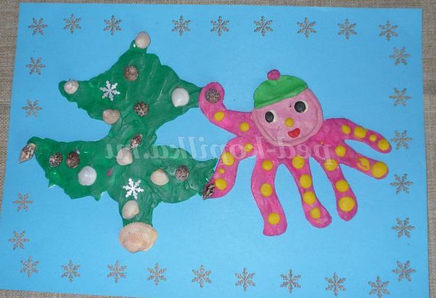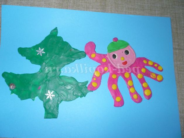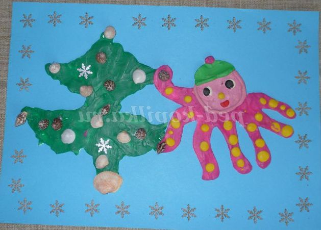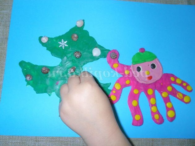 - Використовуючи спосіб загладжування затонувати силует восьминога, колір пластиліну вибрати на свій розсуд (як відомо, восьминоги змінюють свій колір залежно від середовища проживання і від настрою). Таким же способом зробити ялинку.