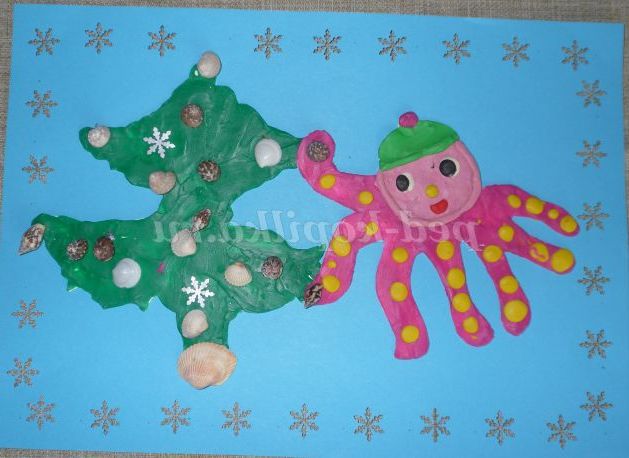 - Наклеїти фігурки восьминога і ялинки на тонований папір, наприклад, блакитного кольору.