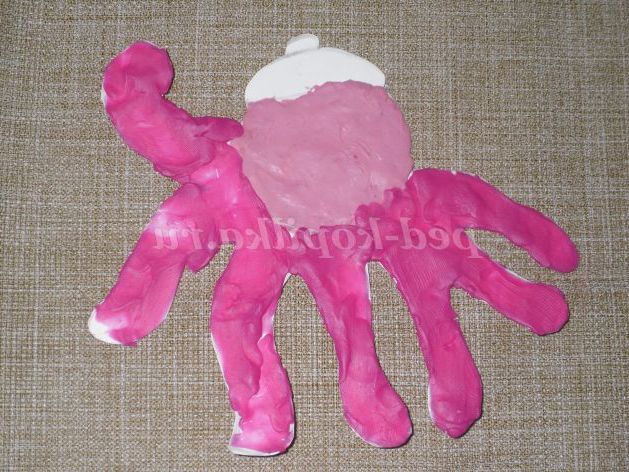 - Виконуючи прийом «налеп» оформити мордочку (очі, ніс, рот) і зробити «присоски». Використовуючи прийом джгутиків виділити мордочку і шапочку восьминога.