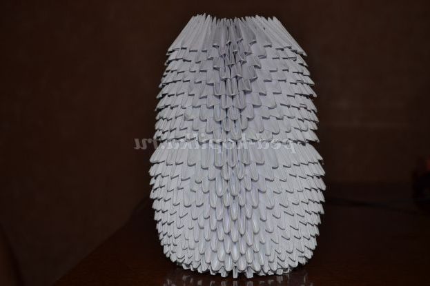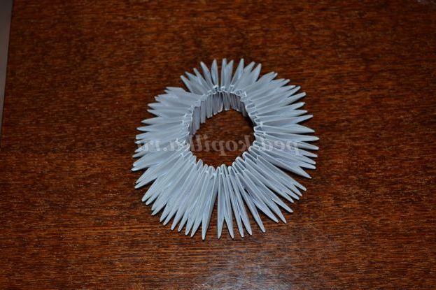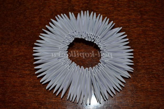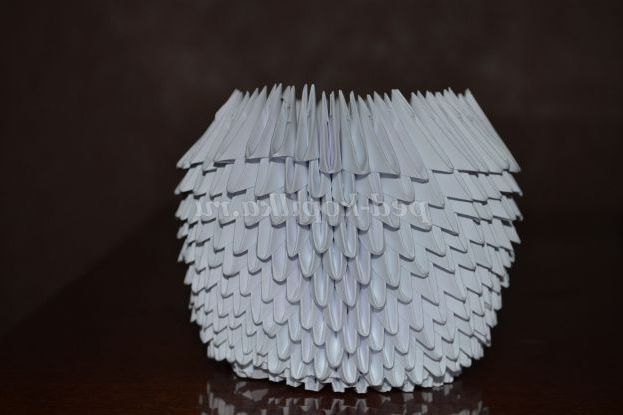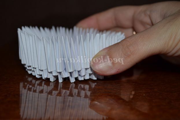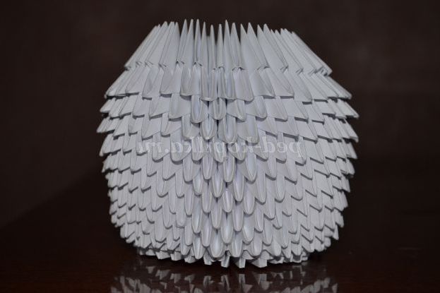 3. Далі продовжуйте збирати по 40 модулів в ряду. Для нижнього, великої кулі, зберіть 16 рядів модулів. У 16-му рядку кількість модулів зменшити на 4 модулі (тобто модулі надягайте не на 4, а на 6 куточків.