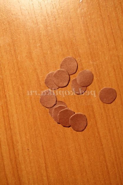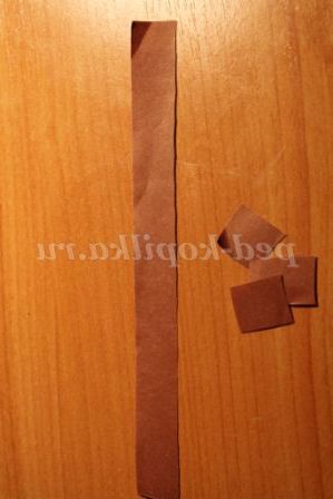 4. Для бабки вам знадобитися коричнево кольору папір. Для початку вам треба нарізати смужки діаметром 1 див. Зі смужок нарізати квадрати 1 см. З них вирізати вирізати 14 кружечків. Вирізані кружечки клеїти на картон один на одного.