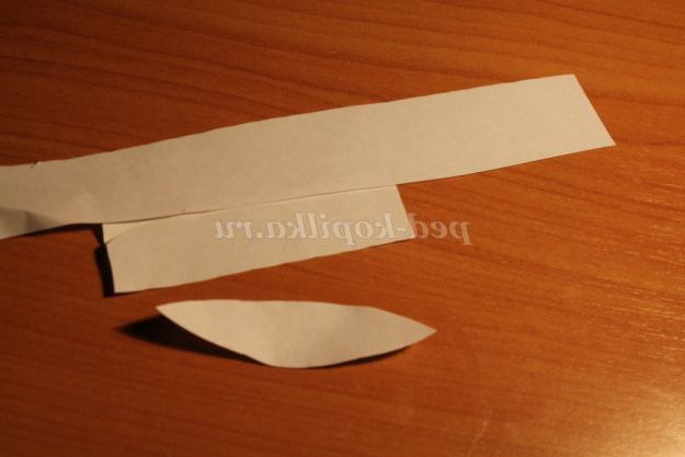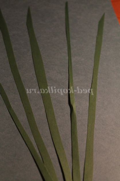1. Взяти папір зеленого кольору. Накреслити на ній 5 смужок довжиною 9 див. На вирізаних смужках з одного боку зробити гострі кінці. Наклеїти на картон зеленого кольору.