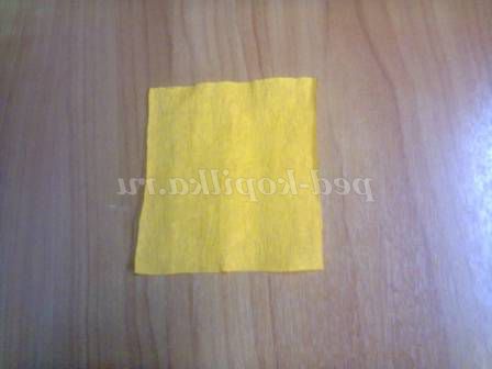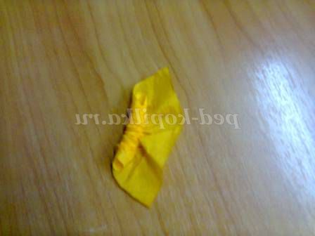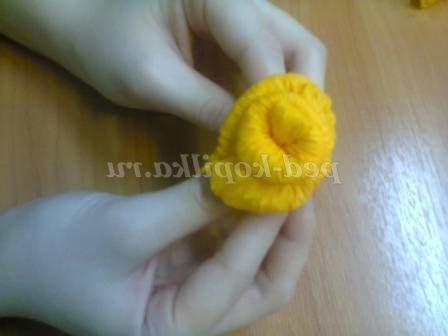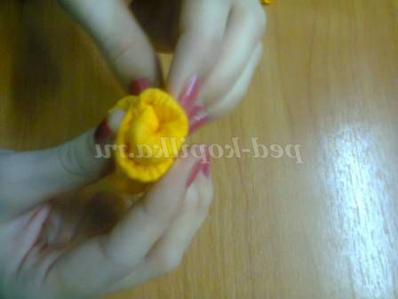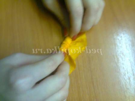 5.Шаг. Беремо один пелюстка і закручуємо його в спіральку, залишаємо невеликий кінчик, який «ховаємо» вниз. З цього кінчика формуємо міні-стеблинка, прокрутивши серветку між пальцями