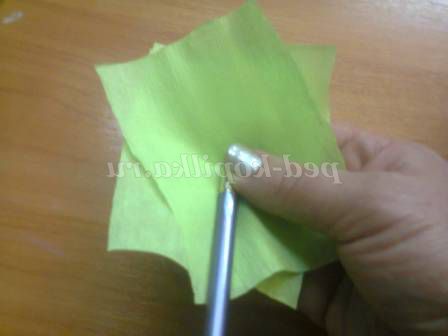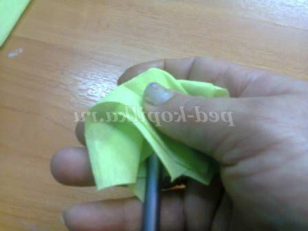 4.Шаг. Беремо папір (один шар) і накручуємо на олівець (або на спицю), не доходячи до краю близько 2 див. Зрушуємо серветку з двох сторін до центру і знімаємо з олівця. Вийшов один пелюстка для троянди. Вийшов один пелюстка для троянди. Для кожної великої троянди крутимо по 5 таких пелюсток.