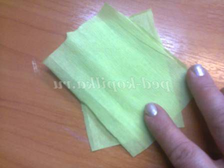 9.Шаг. З паперу зеленого кольору нарізаємо квадрати 3x3 див. Листочки будемо робити як показано на рисунку. Беремо олівець, ставимо тупим кінцем у середину зоготовки і«обіймаємо» серветкою олівець. Притримуючи серветку пальцями, маку заготівлю ПВА і приклеюємо на кулю між трояндами.