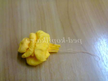 7.Шаг. Повторюємо те ж з наступними пелюстками, кожен новий шар починаємо з того місця, на якому закінчився попередній. Готовий квітка фіксуємо ниткою. Закручуємо нитку дуже щільно якомога ближче до основи. Кінчик обрізаємо. Нам буде потрібно 35 таких троянд