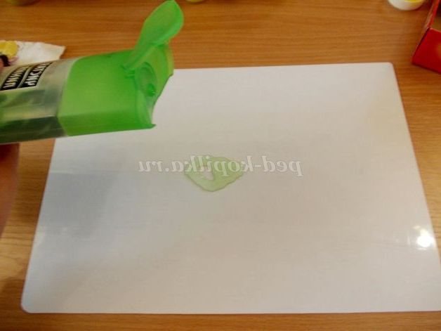 На дошку для ліплення наливаємо шампунь, вона не дасть швидко висохнути фарбам і відбиток вийде більш вигадливим:
