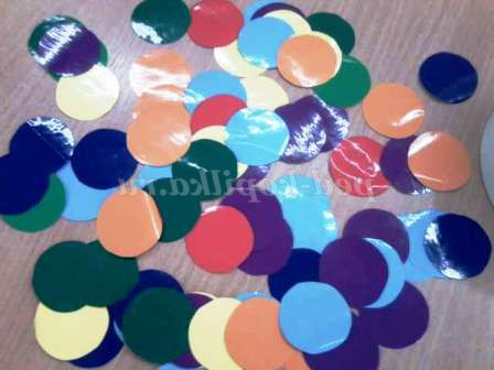 На самому початку роботи потрібно взяти кольорову самоклеющуюся папір, за допомогою лінійки з обвести кружечками на ній кружечки і вирізати їх.