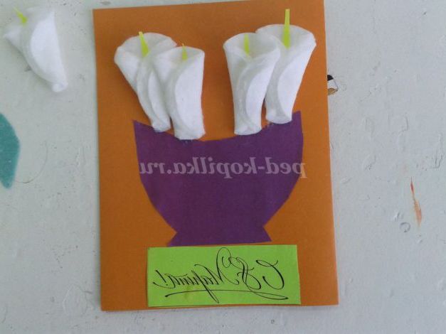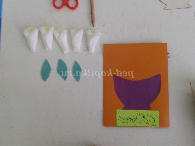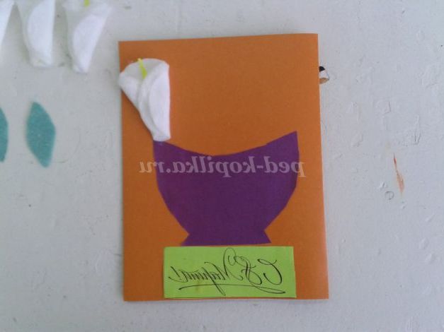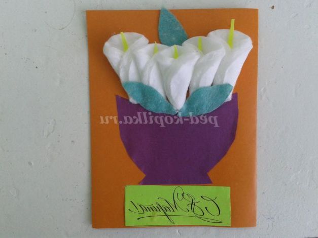 Кольоровий картон, кольоровий папір, ватні диски 5 штук, клей, ножиці, простий олівець, напис «З 8 березня!», шаблон вази, заготівля жовтої серединки квітки Кали 5 штук, заготівля зелених листочків з серветок 3 штук.