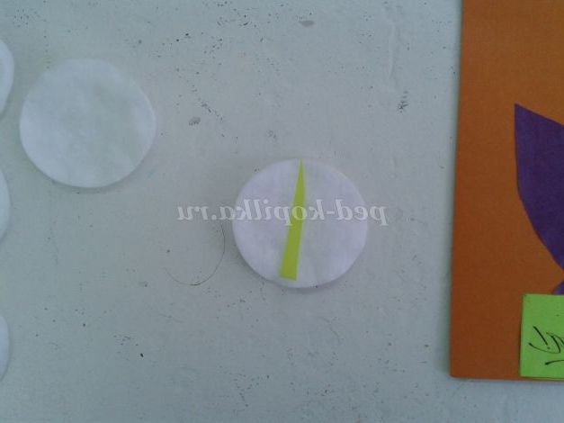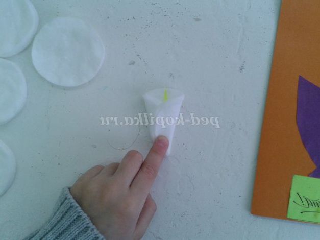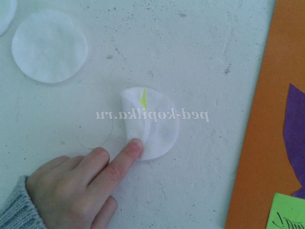 На ватний диск накладаємо заготівлю жовтої серединки квітки і складаємо його у вигляді квітки Кали.