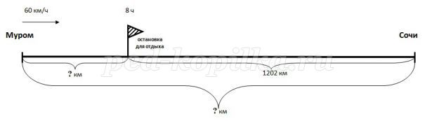 Середня швидкість руху автомобіля 60 км/год. Від Мурома до першої зупинки для відпочинку водій може управляти машиною 8 год. Після зупинки до Сочі треба проїхати ще 1202 км. Яку відстань треба проїхати від Мурома до Сочі?