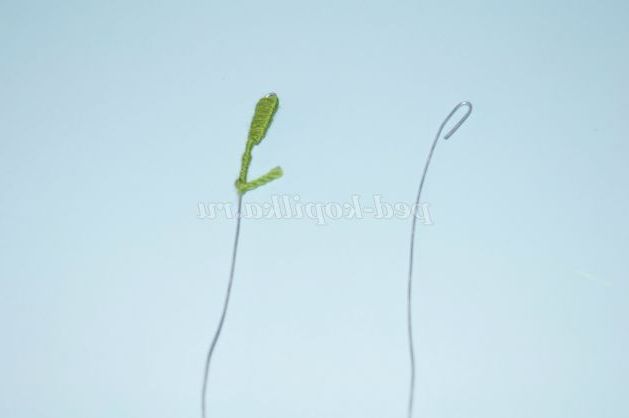 Візьміть дріт 15 см, зігніть кінчик, приблизно в 1,5 см від краю, у вигляді петлі і обмотайте зеленої пряжею навколо дроту на 3-4 див. зав'яжіть вузлик і відріжте