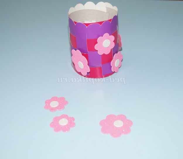 Залишилося нашу вазу прикрасити. Беремо самоклеючі декоративні квіти і приклеюємо до неї. Ось ваза готова!