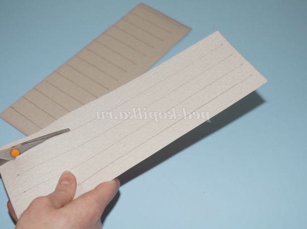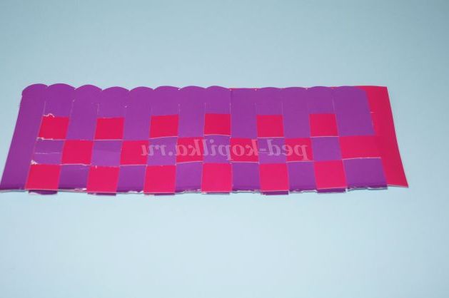 Перевертаємо картон фіолетового кольору і відміряємо по 2 см в довжину до кінця і ріжемо по смугах. На картоні малинового кольору відміряємо по 2 см в ширину і так само відрізаємо по смужках.