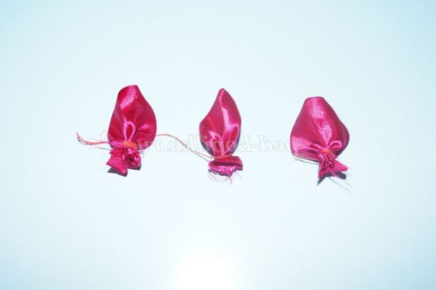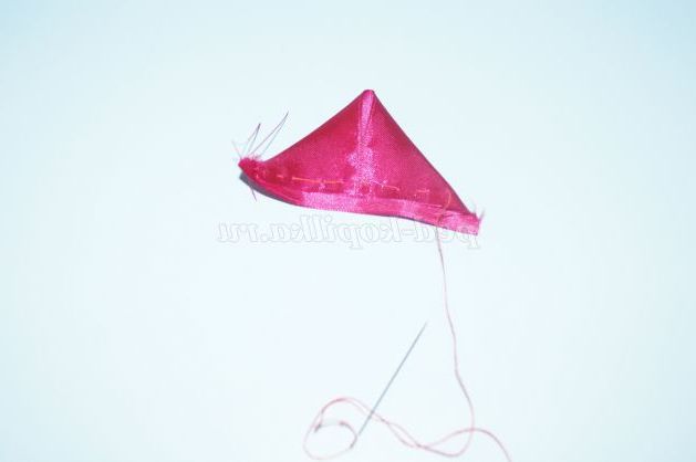 Від атласної стрічки відрізаємо 3 шматочки по 3 см і складаємо ці шматочки кутиками до себе, виходить трикутник.