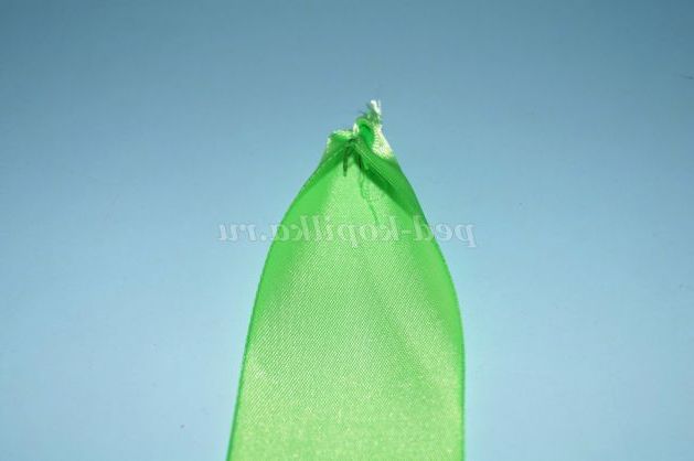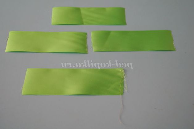 Від зеленої стрічки відріжте 3 шматочки по 16 см кожен і прошийте по краю пунктирним стібком (на відстані 5 мм від краю)і закріпіть обидва краї