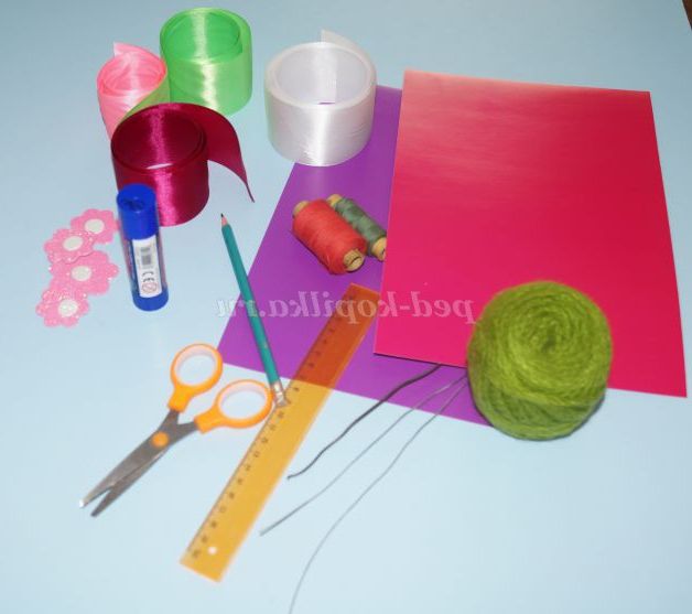 Вам знадобиться : кольоровий картон, кольорові атласні стрічки шириною 5 см, дріт, пряжа, декоративні прикраси, ножиці, простий олівець, лінійка, клей, голка, нитки.