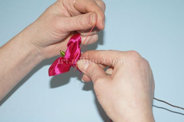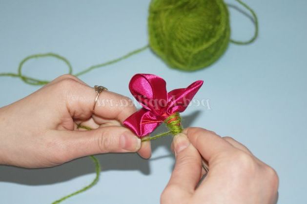 Беремо вже готові пелюстки, обережно розташуйте їх навколо стеблинки, закріпіть ниткою, обмотуючи навколо стебла