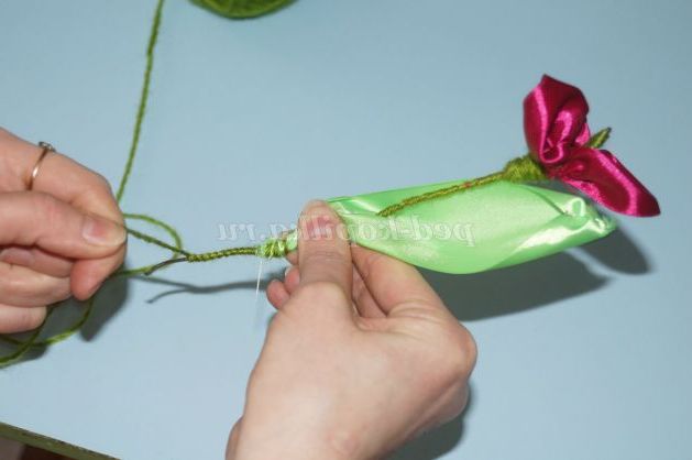 Обмотку зеленої пряжею починаємо з стеблинки біля квітки, роблячи ущільнення біля основи пелюсток і рухаємося вниз.