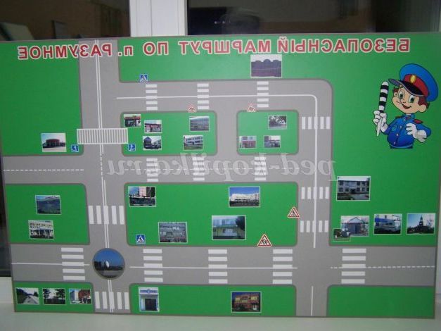 Макет «Безпечний маршрут по п. Розумне» був виготовлений з пластику та клейонки. Почну з самого початку спочатку я накреслила схему нашого селища на картоні, вказавши всі дороги, будівлі ( підписом) і пішохідні переходи. Потім віддала в агентство (по випуску стендів), вони перенесли мій креслення у спеціальну програму. Після чого я сіла в машину і об'їхавши весь селище зробила фото будівель найбільш відомі нашим дошкільнятам. Віддала фото в агентство для того, щоб вони вставили в схему ( в ті місця де були підписи будівель ,наприклад: «Школа №1, дитячий садок № 28, пошта, магазин, адміністрація, ринок і т.д.» після того як макет був перевірений його надрукували на клейонку і вже потім наклеїли на пластик для міцності і зручності, такий макет можна повісити на стіну (граючи на ньому пальчиками) Наприклад гра: «Пройди безпечний шлях від дитячого садочка №28 до школи №1» та ін.. А можна і покласти на стіл поставити на нього різний додатковий матеріал, який є в групі (міні - машинки, багатоповерхові будинки, пост Даі, заправка, дерева, світлофор та ін)