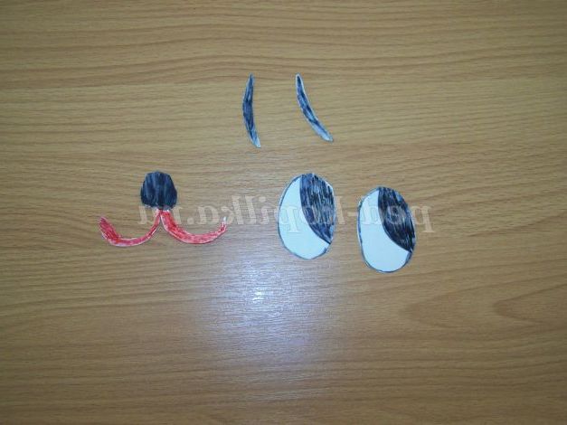 Виріжемо очі з білого паперу і розфарбуємо чорним кольором. Носик і ротик. Брови.