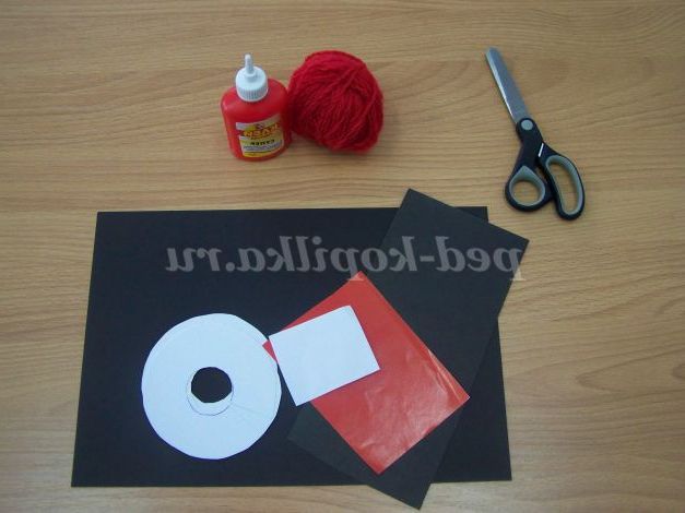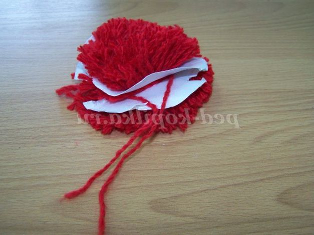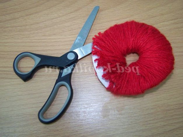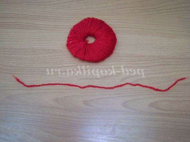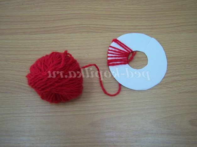 Виріжемо з картону 2 кола d=10 см, посередині кола виріжемо коло d=2 див. З'єднаємо і обмотаємо вовняними нитками червоного кольору.