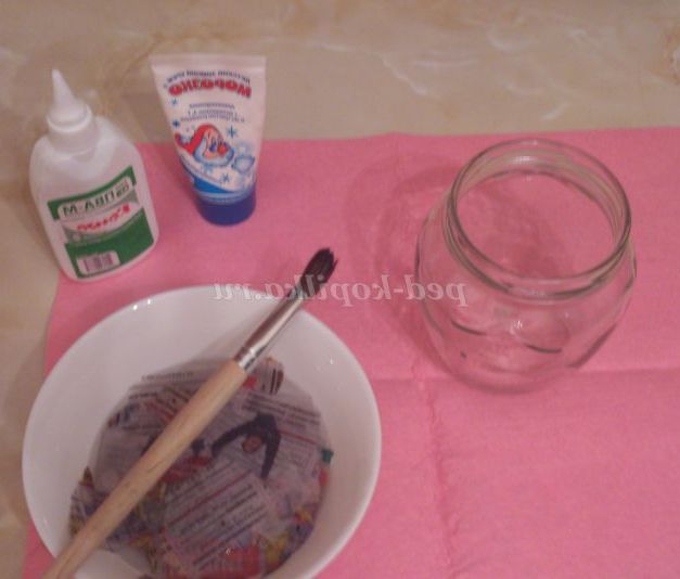 2. Змастити клеєм ПВА вазу і обклеїти шматочками газети її в 5-8 шарів. Кожен шар повинен підсохнути. Шматочки газети необхідно притискати ганчірочкою. Проклеєну вазу необхідно залишити висихати близько двох днів.