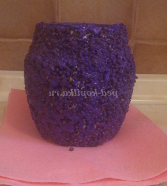 3. Потім необхідно нанести на вазу невеликими ділянками густий клей ПВА і густо посипати гречаною крупою. Гречану крупу необхідно притискати рукою до поверхні . Покрити вазу повністю гречаною крупою і дати їй підсохнути.