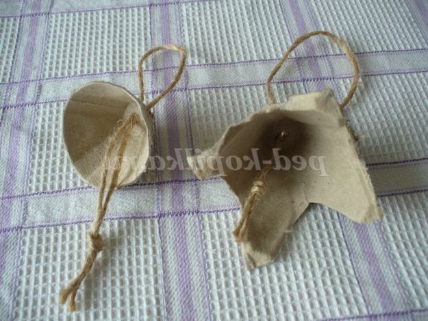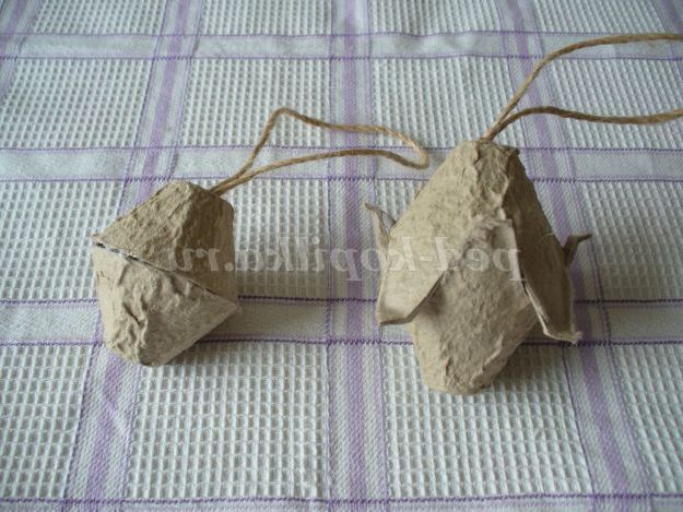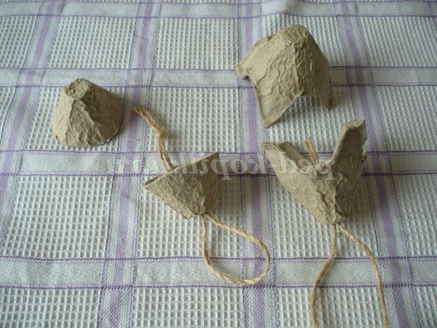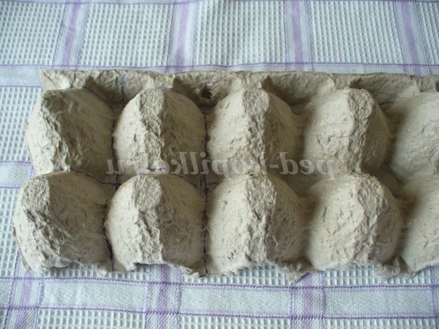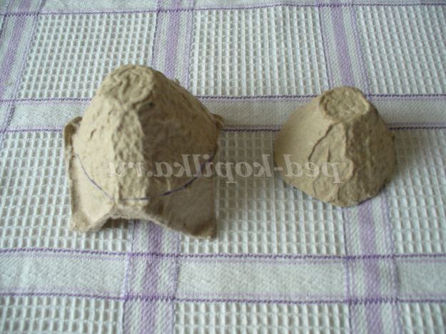 Розрізаємо яєчний лоток по намічених лініях. Будемо виготовляти два варіанти. Для кожної іграшки знадобитися по дві деталі.