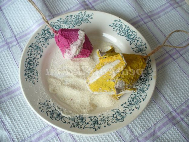 Розфарбовуємо на свій розсуд, після висихання фарби приступаємо до прикраси. Наносимо густо клей ПВА і посипаємо манкою. Отримуємо ефект снігу.