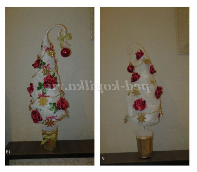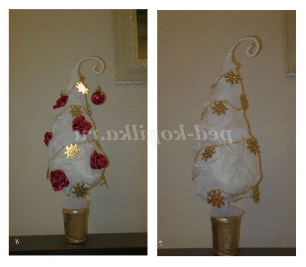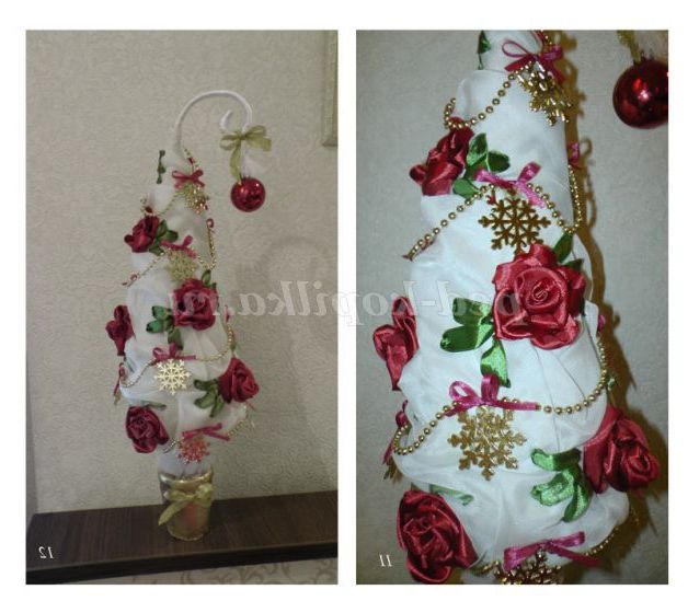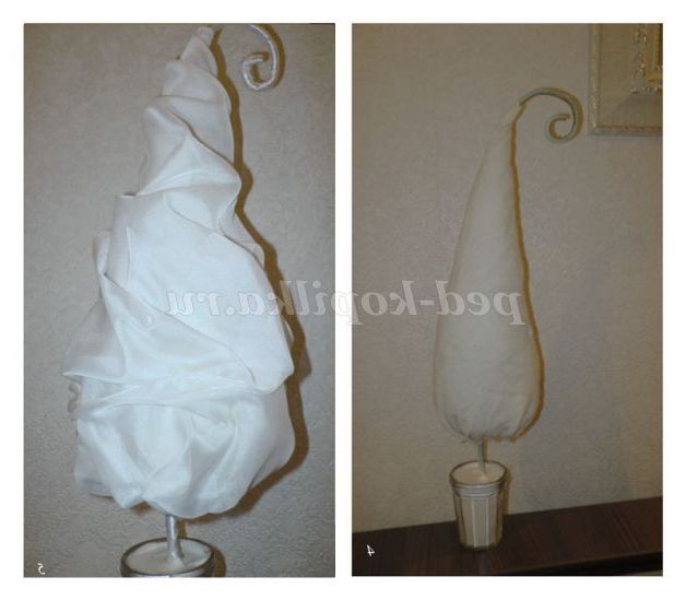 Обмотуємо стовбур і кінчик-завиток стрічкою, закріплюючи її термо-пістолетом. З допомогою тюлю або органзи (мережива) формуємо останній шар тканини на кроні ялинки, створюючи складки на свій розсуд, закріплюємо термо-пістолетом або пришиваємо. (фото 5.)