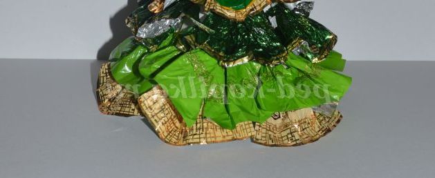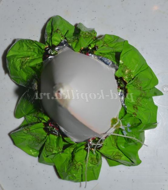 Нижній ярус теж можна прикрасити фантиками іншого кольору. Все робимо, як 3 способом, тільки фантики одного кольору. Прикріплюємо під зелені гілочки на двосторонній скотч.