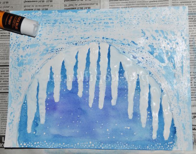 Білу гуаш розлучень до стану рідкої сметани і широким пензлем, стусаном, малюємо сталактити.