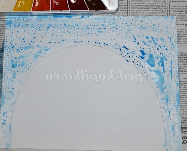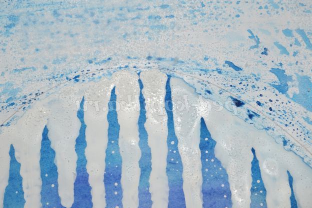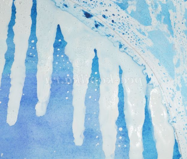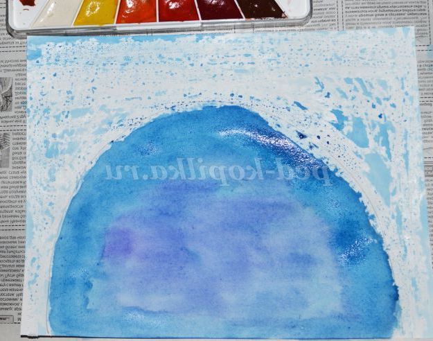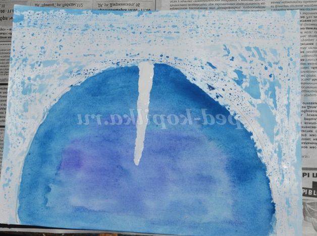 Набираємо на пензлик акварельну фарбу синього, блакитного або фіолетового кольору і зафарбовуємо всю частину аркуша, натерту свічкою. Фарба залишиться тільки на папері і у нас вийде «сніг».