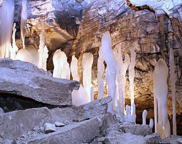 "Царство вічної холоднечі і крижаного безмовності..." кожному дарує незабутні враження від подорожі під землею, де з каменю і льоду природа створила казковий палац, де сліпуче біле мереживо виблискуючих кристалів змінюється похмурим нагромадженням кам'яних скель.