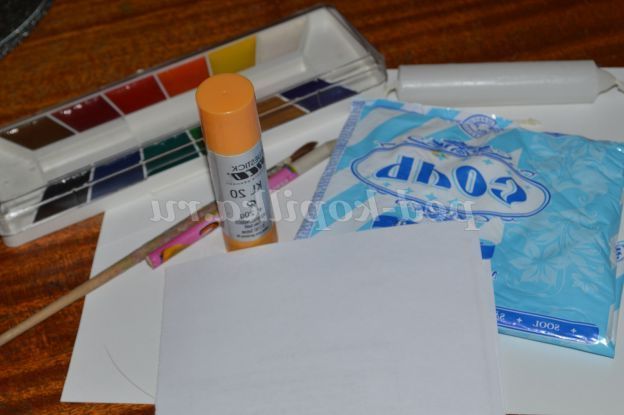 Лист щільного паперу, простий олівець, свічка парафінова, фарби акварельні, біла гуаш, широка пензлик, клей - олівець, сіль.