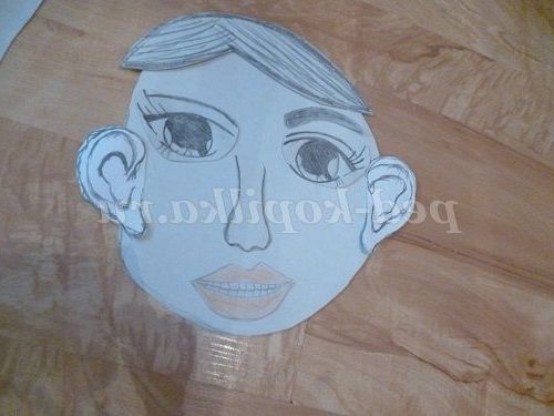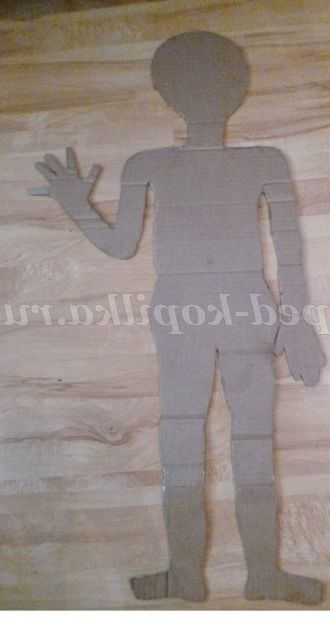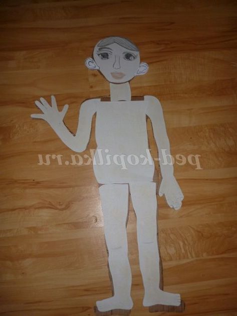 На аркуші пакувального картону зображуємо безлику фігуру людини і вирізаємо по контуру. Потім із звичайного білого щільного картону виготовляємо окремі частини фігури. Для цього обводимо кожну частину основи макета окремо, барвисто оформляємо і вирізаємо. Частини обличчя та внутрішні органи так само зображуємо на картоні і вирізаємо.