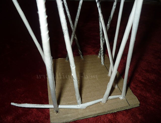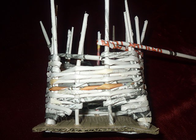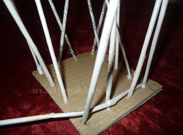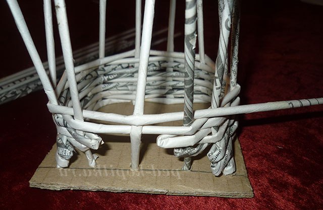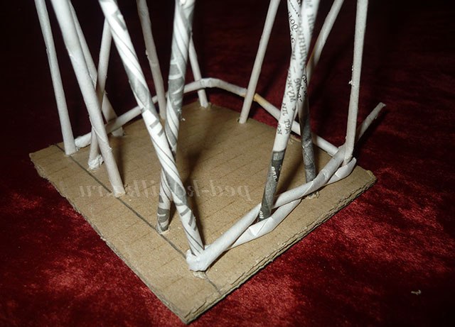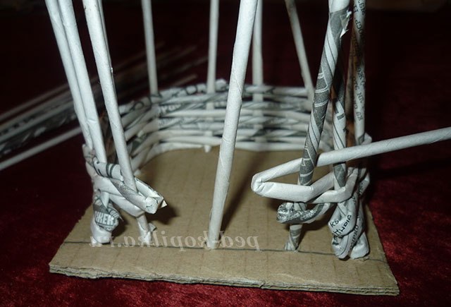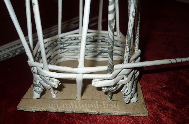 6. Дійшовши до задуманої висоти будиночка останній ряд проплетаем в дві трубочки: до робочої трубочки підклеюємо ще одну трубочку і перекручуючи між стоячими трубочками огинаємо їх з двох сторін. Це дозволить закріпити і не розсипатися плетіння. Непотрібні хвостики обрізаємо.