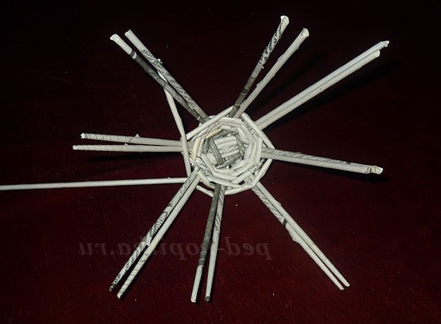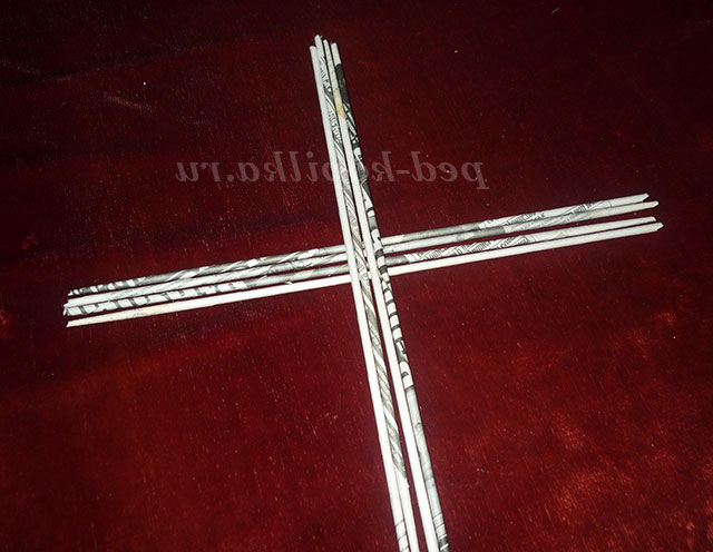 1. Беремо 10 трубочок, ділимо їх по 5 у кожній купці. Складаємо навхрест і обплітає, складеної навпіл трубочкою подвійним плетінням (плетіння в дві трубочки).