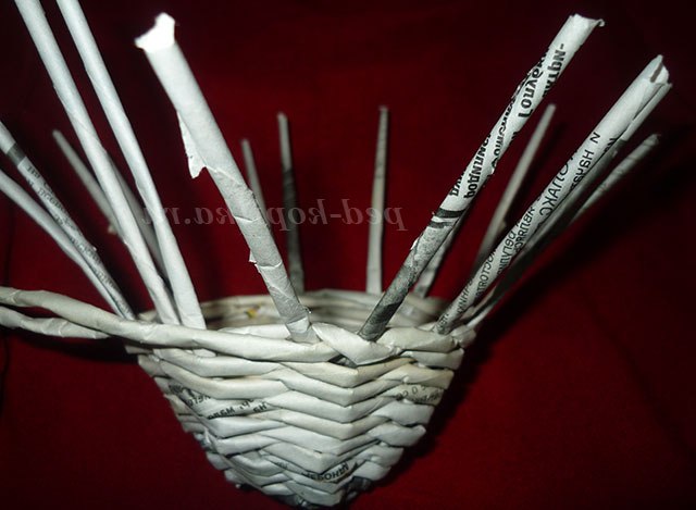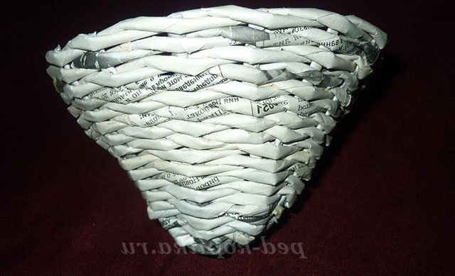 1. Приступаємо до роботи з виготовлення паперових трубочок: нарізаємо газетні смуги шириною 9 див. прикладаємо спицю до лівого нижнього кута смуги і під кутом приблизно 45 градусів намотуємо її на спицю. Трубочки повинні бути щільними. Склеюємо.